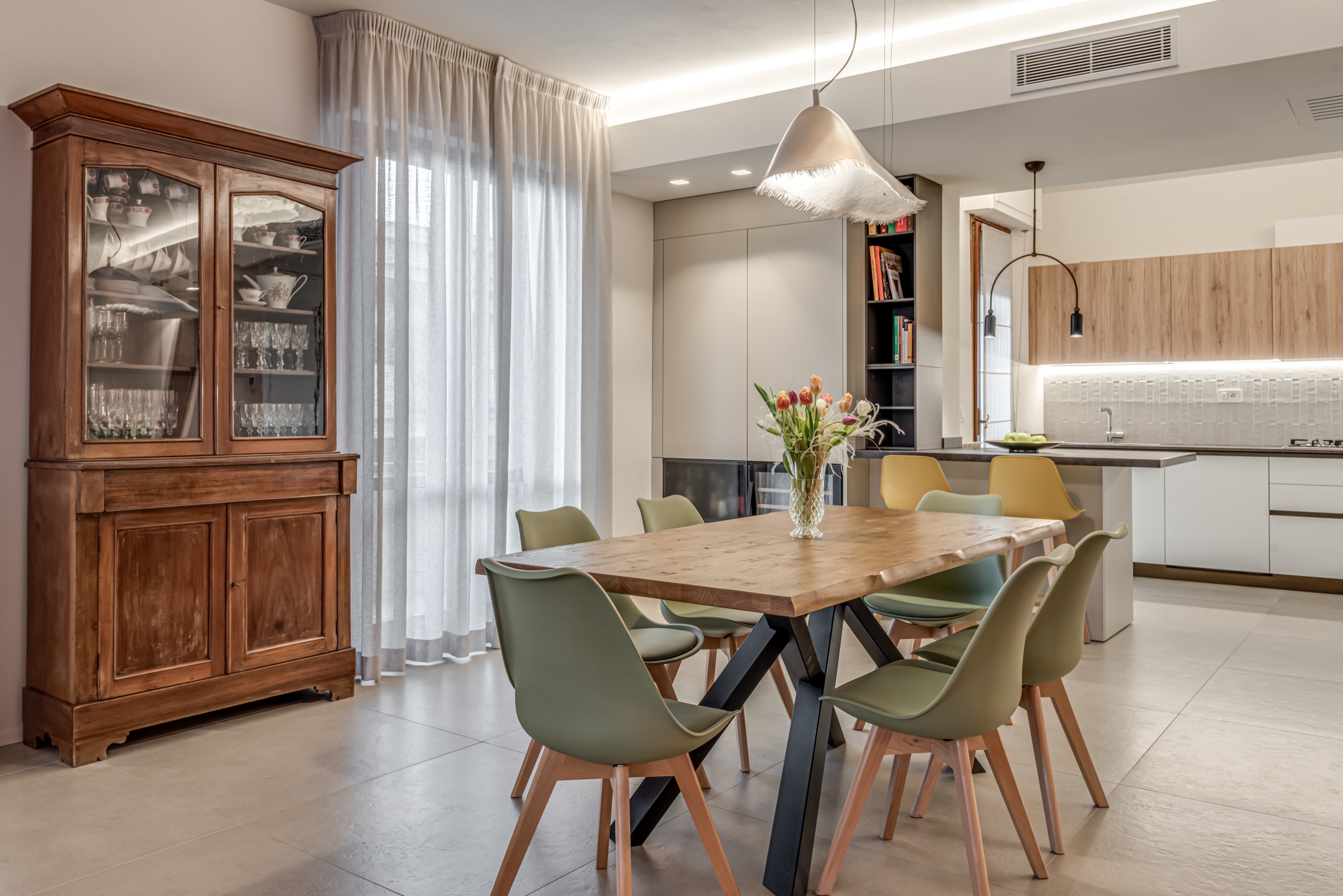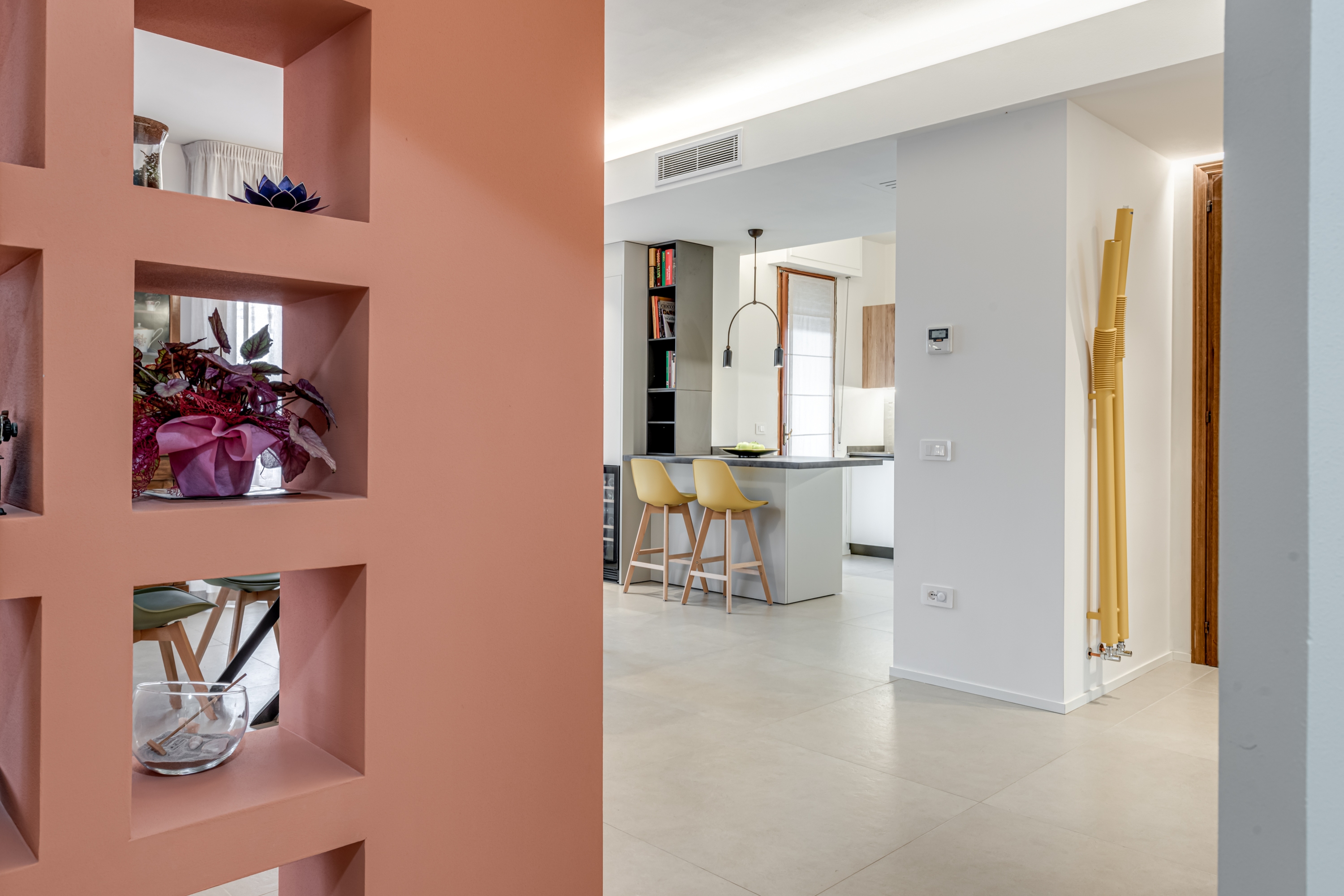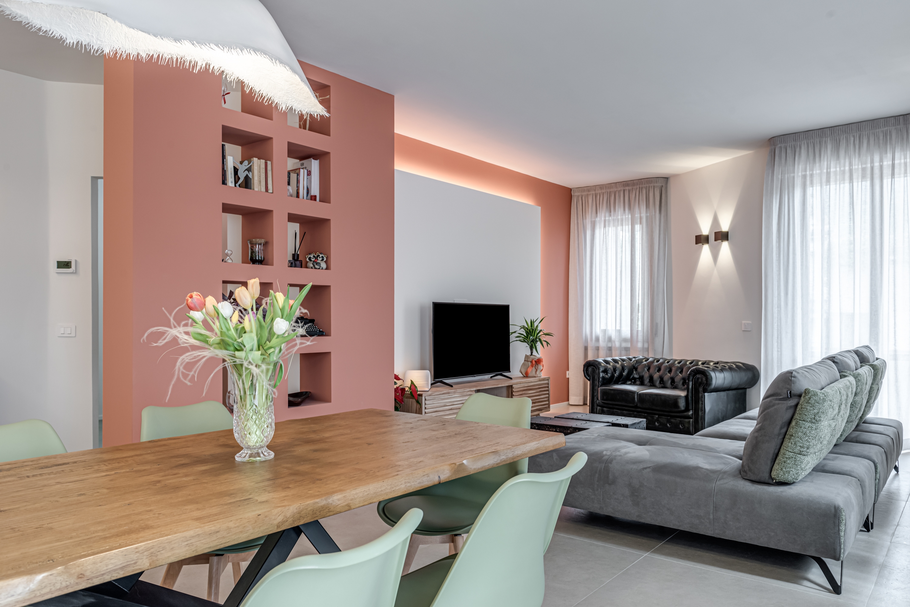 In questo intervento la voglia di creare uno spazio che finalmente specchi la propria personalità e risponda a nuove esigenze, va a braccetto con il desiderio di portare in questo nuovo viaggio una valigia di ricordi che dialoghino con il presente fatto di mobili in stile che si armonizzano con un look lineare e contemporaneo. La richiesta è stata quella di creare un luogo di pace, dai colori caldi e rilassanti, ma anche un luogo dove poter accogliere amici e condividere con loro momenti di convivialità.
