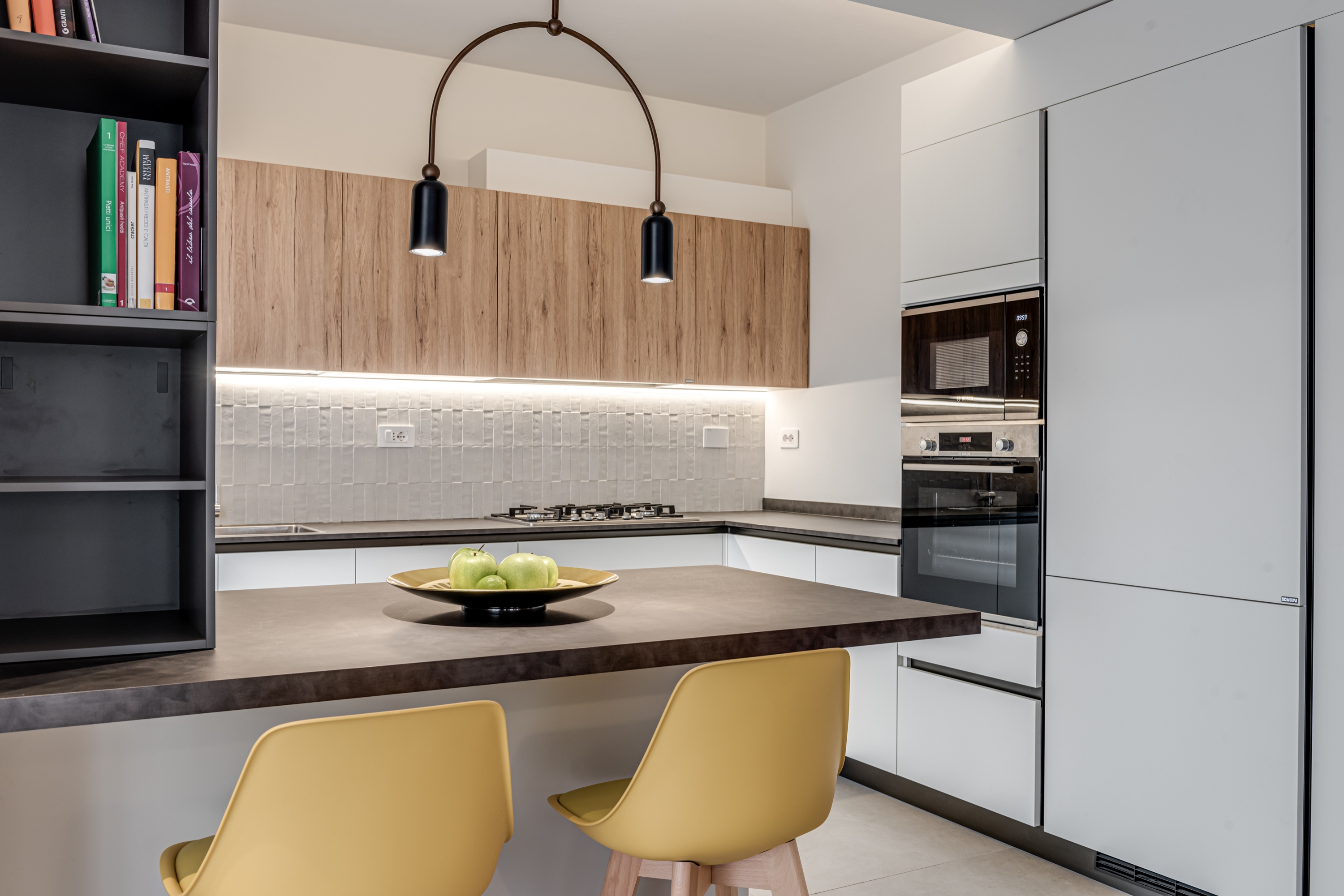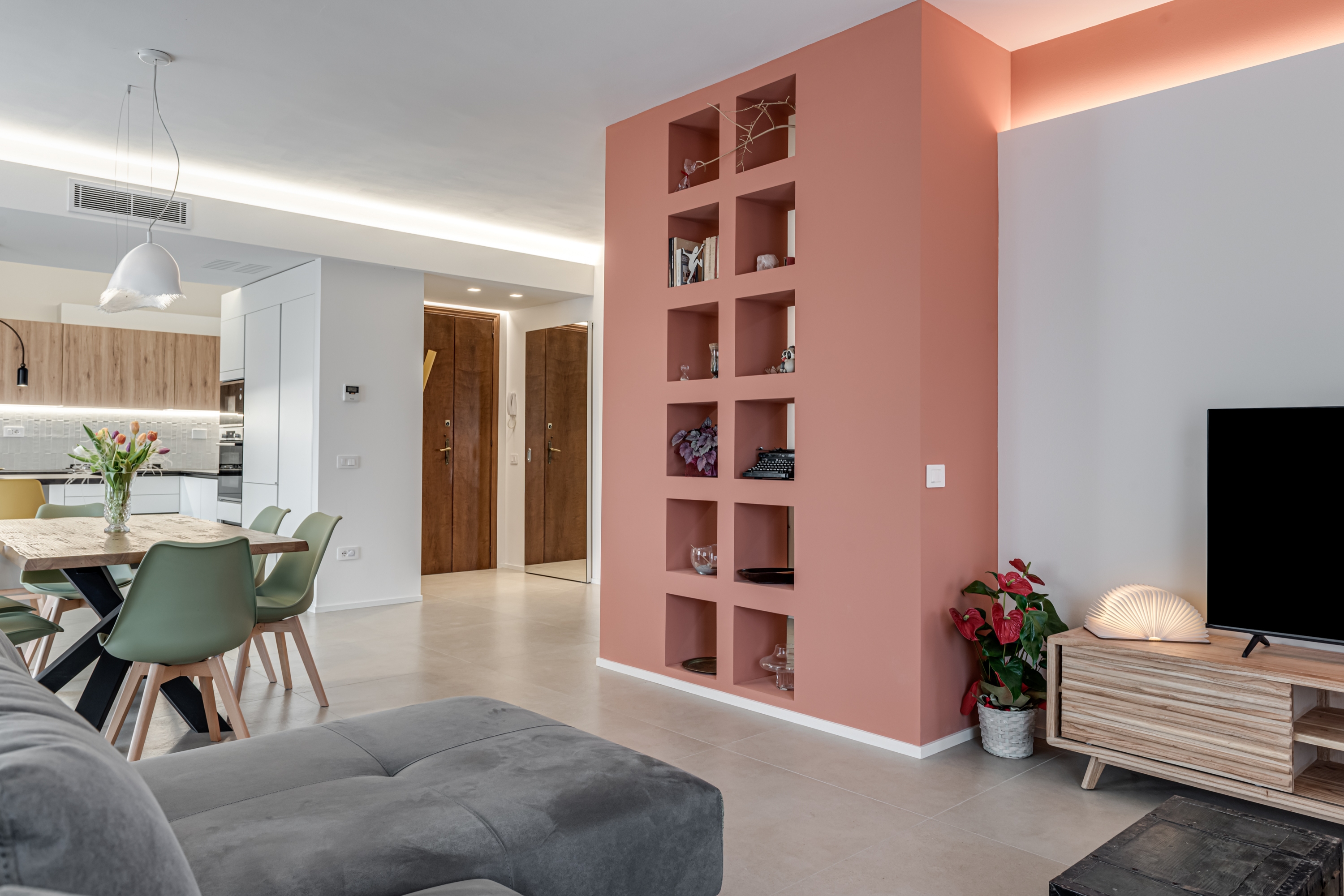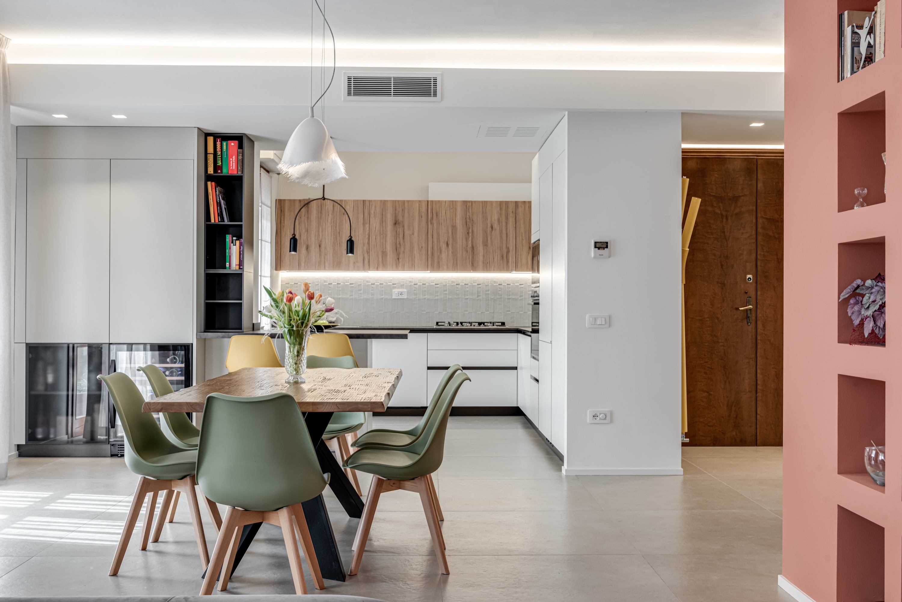 In questo intervento la voglia di creare uno spazio che finalmente specchi la propria personalità e risponda a nuove esigenze, va a braccetto con il desiderio di portare in questo nuovo viaggio una valigia di ricordi che dialoghino con il presente fatto di mobili in stile che si armonizzano con un look lineare e contemporaneo. La richiesta è stata quella di creare un luogo di pace, dai colori caldi e rilassanti, ma anche un luogo dove poter accogliere amici e condividere con loro momenti di convivialità.